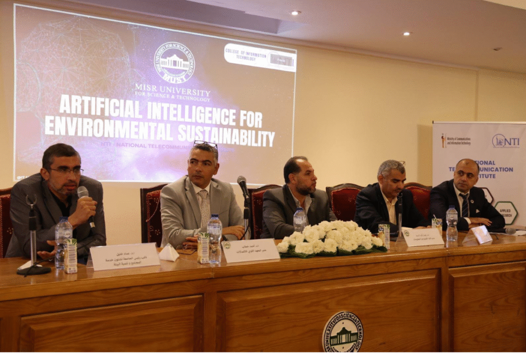 The National Telecommunication Institute (NTI), in collaboration with Misr University for Science and Technology (MUST), organized a conference themed “Artificial Intelligence for Environmental Sustainability.” The event aimed to promote research, innovation, and the application of modern technologies in addressing environmental challenges.