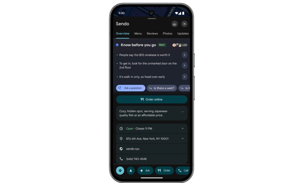 Now, when you search for places in Maps like restaurants, hotels or concert venues, scroll down to find new “know before you go” tips — it’s like having a knowledgeable guide show you the way. Using Gemini capabilities, Maps does the research for you: It uses reviews and helpful information it finds online to surface top insights, like the best way to book a reservation, what the secret menu items are, parking tips and more — and you can click on each of the tips to get more information.