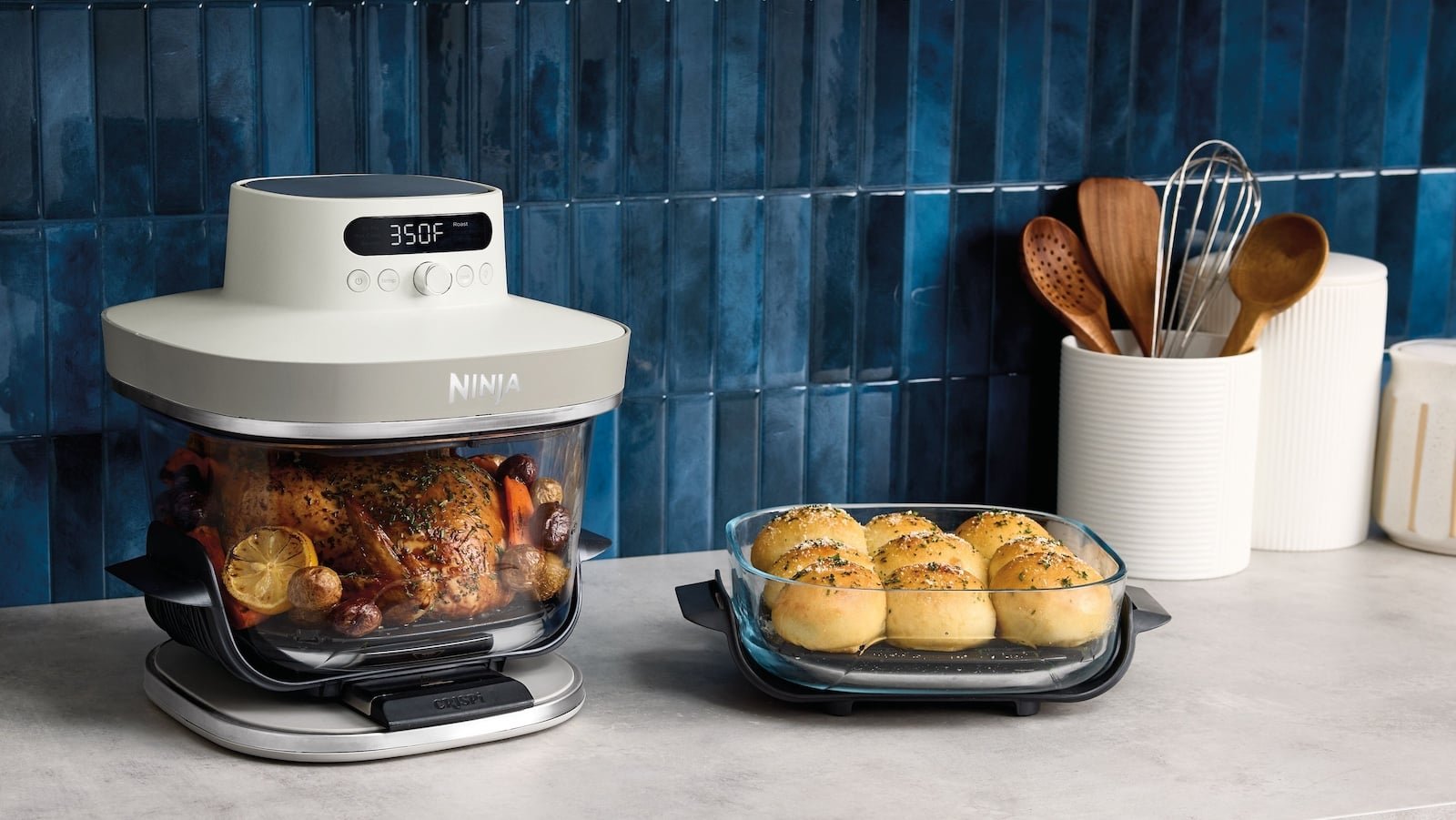 Meet the Ninja Crispi Pro, a 6-in-1 dual glass air fryer. It cooks main dishes and sides simultaneously with clear, non-toxic bowls.
